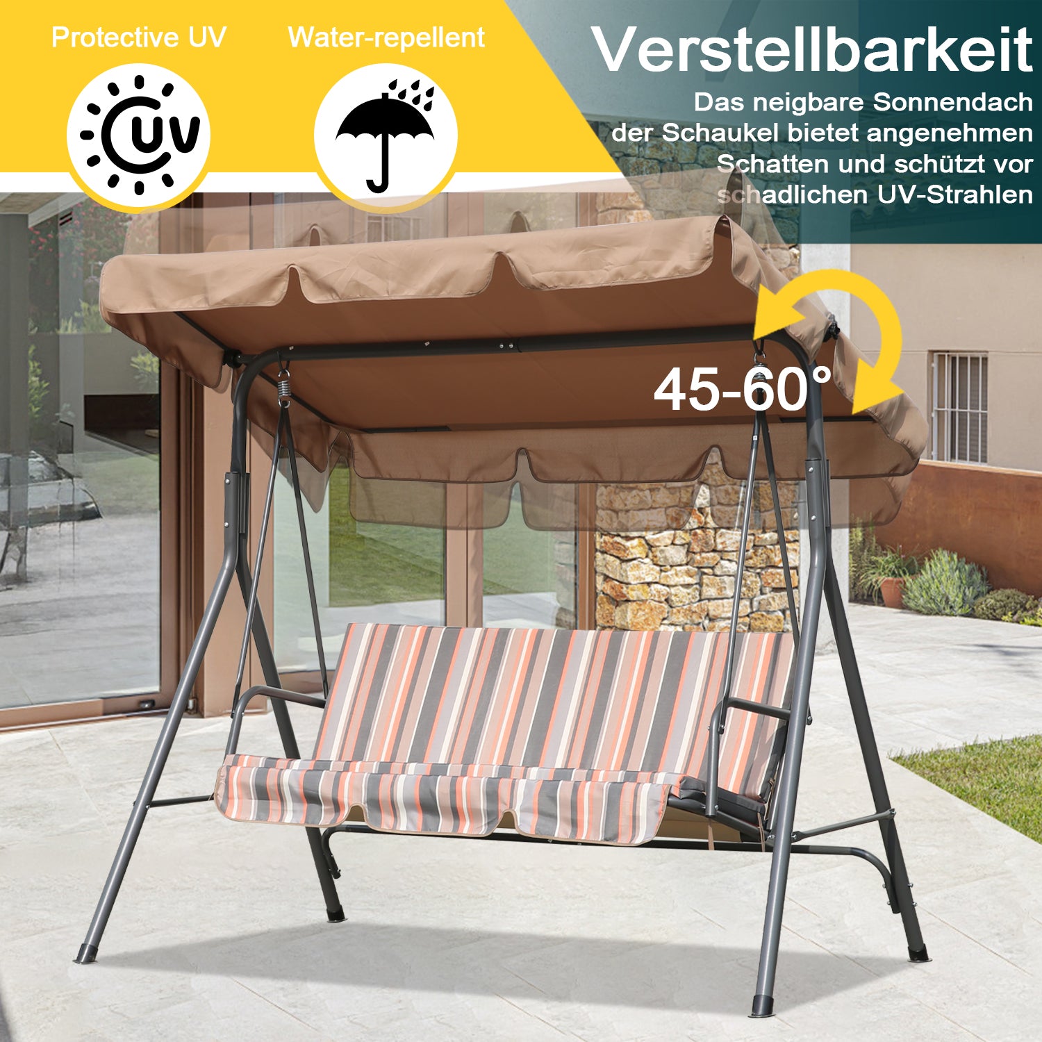 Durch das Verstellbares Dach bietet diese Schaukel idealen Schutz vor der Sonne.Schützen Sie sich mit dem UV-geschützten Polyesterdach.